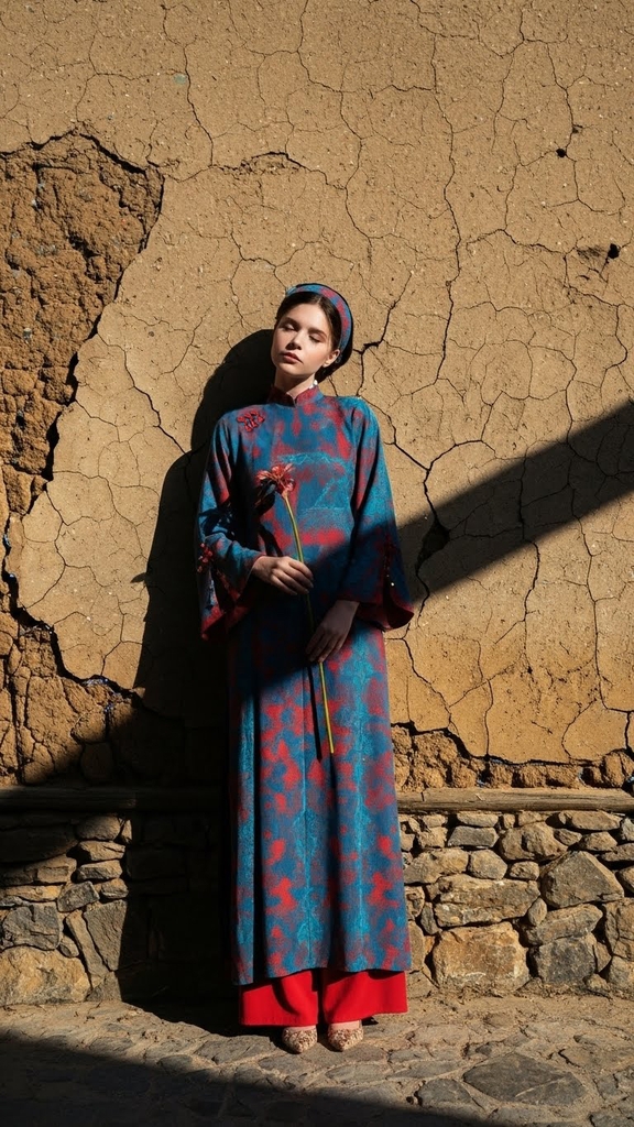 Áo dài lụa xanh dương quần đỏ TRALI 25903 Khuyến mại - ưu đãi