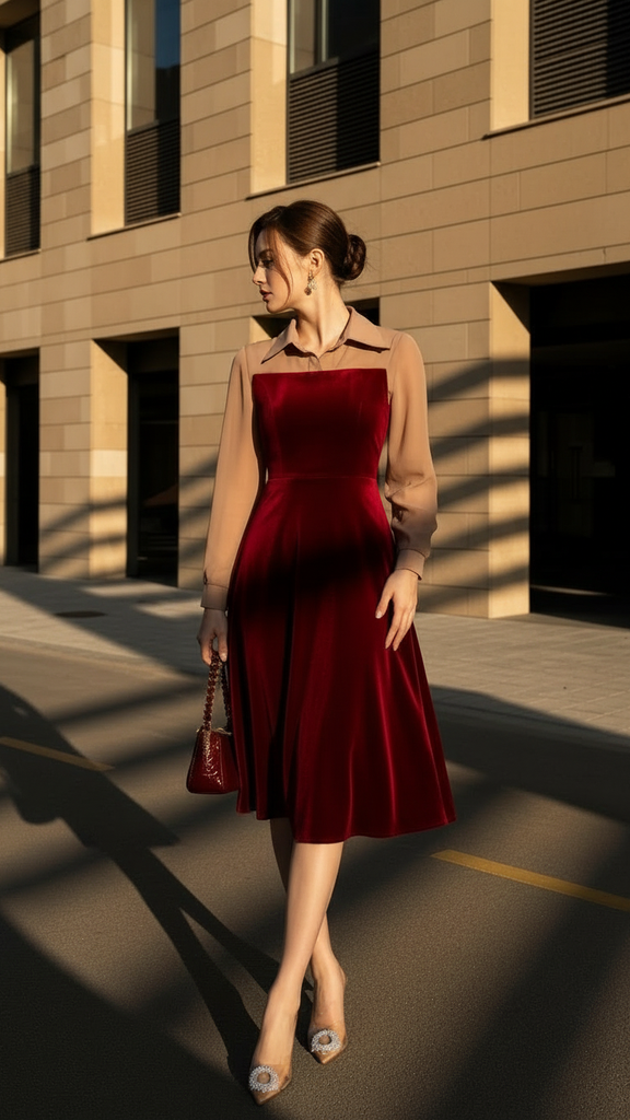 Đầm nhung hàn đỏ phối lụa Trali 25222 màu Nâu