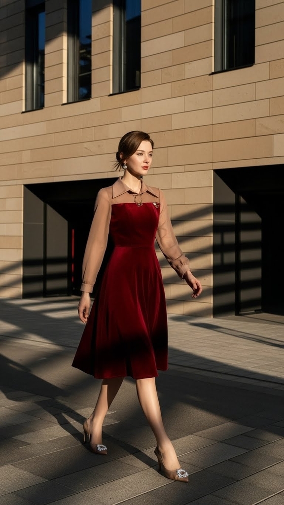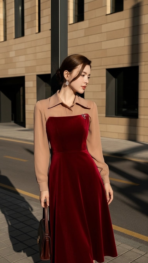 Đầm nhung hàn đỏ phối lụa Trali 25222 màu Nâu | THỜI TRANG TRALI Đầm nhung hàn đỏ phối lụa Trali 25222 màu Nâu