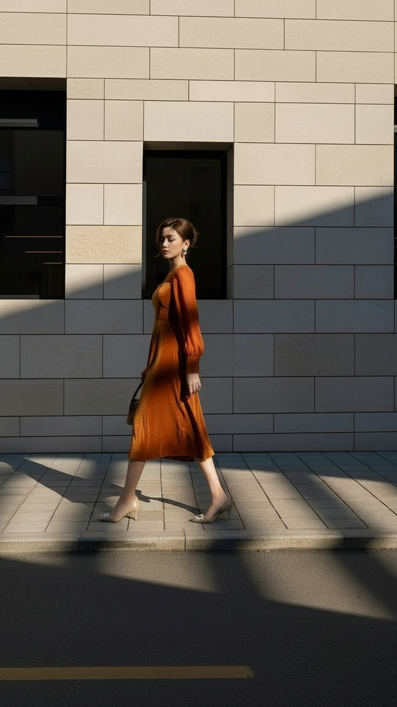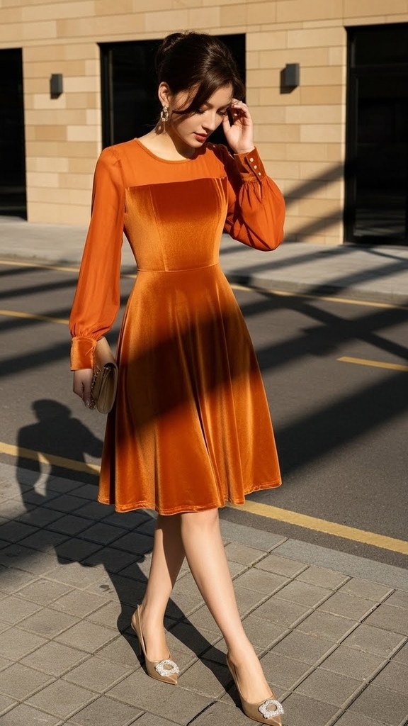 Đầm nhung phối tơ TRALI 25221 màu Cam Khuyến mại - ưu đãi