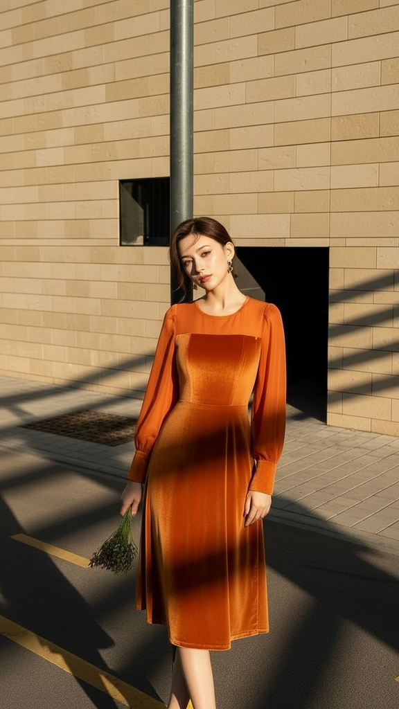 Đầm nhung phối tơ TRALI 25221 màu Cam